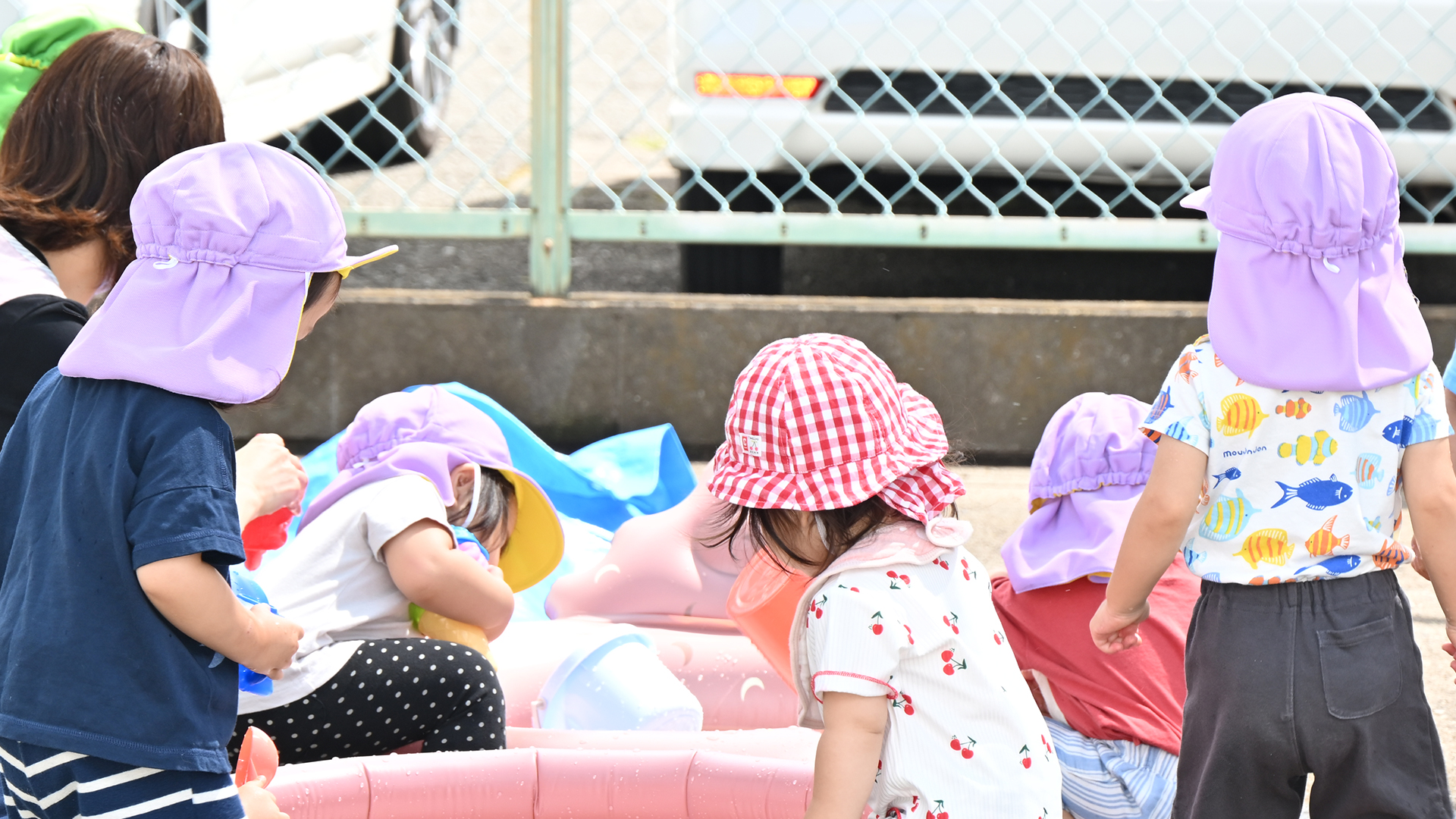 また、送迎用駐車スペース、中庭での水遊びや砂場遊びができるよう整備しています。